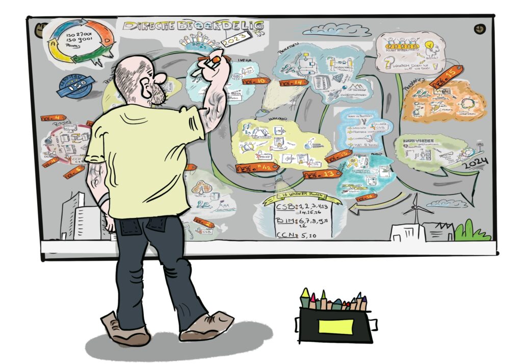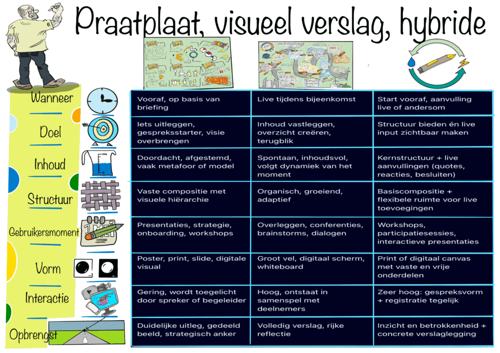 Een visueel verslag is een tekening die in real-time wordt gemaakt met behulp van eenvoudige woorden en afbeeldingen. Het resultaat is een visuele samenvatting van de belangrijkste conclusies.